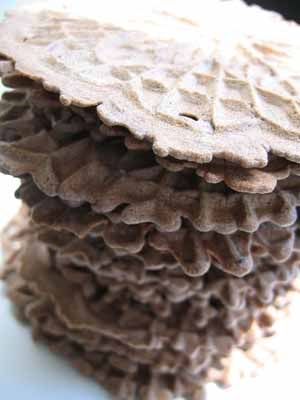 We made old-fashioned pizzelles a couple of times, S and I, before I had to make a confession: I just don’t like licorice that much. It was one thing to eat pizzelles as a special treat from Big Gram, but it was another thing altogether to make them ourselves every week or two. The booklet had a recipe variation for pizzelle con cioccolate—using cocoa powder and a little more sugar, and leaving out the anise extract—that sounded interesting. S was game (who can turn down a new way to eat chocolate, after all?) so we tried it. They were wonderful, not too sweet, nicely chocolaty, and perfect with a cup of coffee. Over time I played with the recipe a little, to lighten it, and it tastes every bit as good as it did the first time I made them. Recently I picked up a simple wooden gadget at a kitchen supply store, and made a new treat: homemade chocolate ice cream cones!