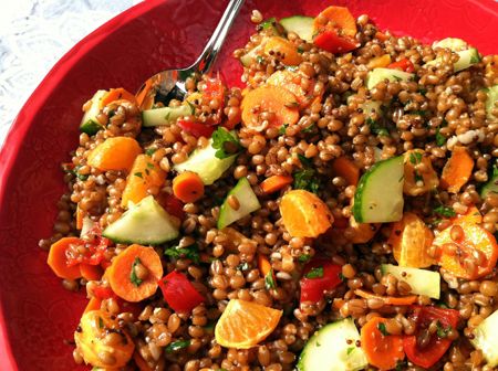 The first formula I tried, for a grain salad (halved, to serve 2), was a huge success: I tossed 2 cups of wheat berries (my fave) with 1 1/2 cups of chopped vegetables (carrot, cucumber, and—going off-list here—clementines). From the “extras” category, I chopped 1/4 cup of peppadew peppers for a spicy-sweet burst. Added some finely chopped shallot and a couple tablespoons of chopped mint and parsley, and tossed it all together with half a batch of Pam’s Lemon-Mustard Vinaigrette (1/2 a medium clove garlic, minced, 1 tablespoon lemon juice, 1 tablespoon Dijon mustard, 1/1 tablespoon rice vinegar, salt & pepper, and 1/4 cup extra-virgin olive oil). A friend and I feasted on the result, a simple, satisfying, healthy-but-not-austere lunch packed with bright, clean flavors.
